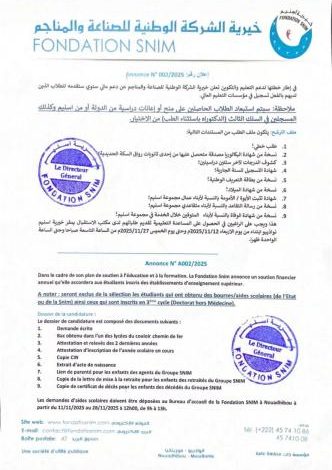 الراصد : أعلنت خيرية الشركة الوطنية للصناعة والمناجم اسنيم، عن فتح باب الترشح للاستفادة من الدعم السنوي لطلاب التعليم العالي الحاصلين على الباكلوريا في إحدى المدن المحاذية للسكة الحديدية، بما فيها انواذيبو وازويرات.