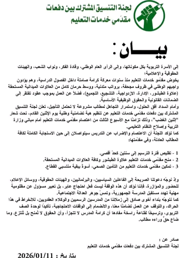 وأمام انسداد أفق الحلول، واستمرار التجاهل لمطالب مشروعة لا تحتمل التأجيل، تعلن لجنة التنسيق المشترك بين دفعات مقدّمي خدمات التعليم عن تنظيم هبة تضامنية وطنية يوم الإثنين القادم، تحت شعار “إثنين الغضب”، وذلك تزامنًا مع الأسبوع الثالث من اعتصام مقدّمي خدمات التعليم أمام مباني وزارة التربية وإصلاح النظام التعليمي.