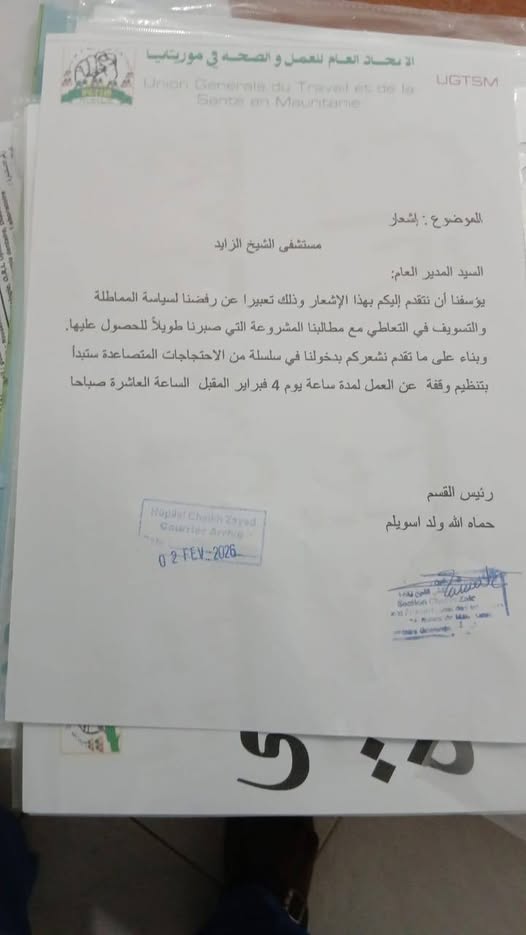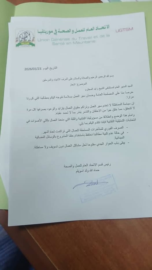 يضع الاتحاد العام للعمل والصحة إدارة المستشفى أمام مسؤولياتها التاريخية، مطالباً "بالتحرك الفوري" لتسوية الملف. فالتحذير بات واضحاً: الصبر النقابي شارف على النفاد، والملف قد "يخرج عن نطاق السيطرة" ويتجه نحو تصعيد مفتوح لن يكون المتضرر الوحيد منه سوى المريض الموريتاني البسيط.