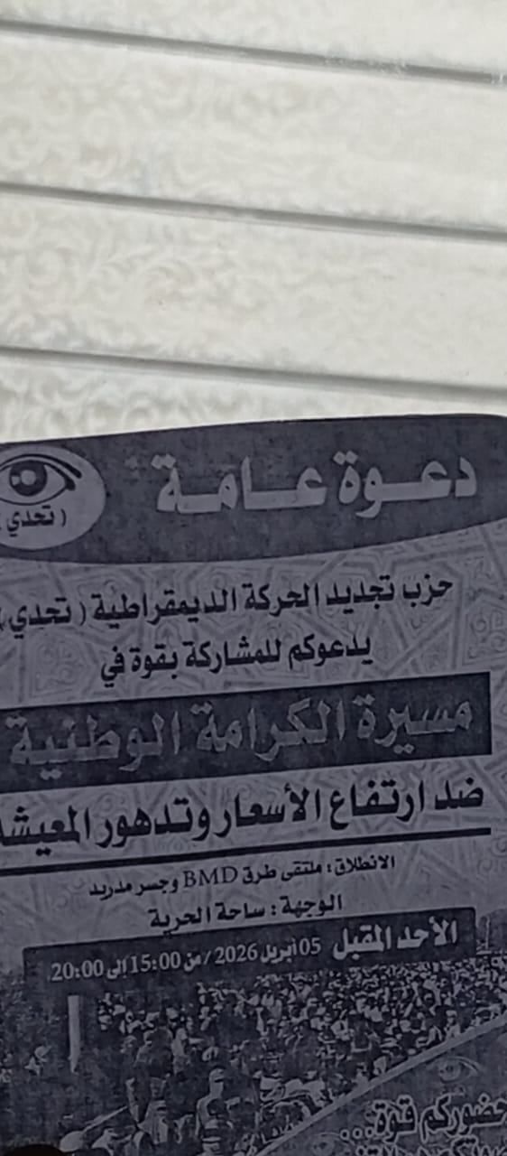 الراصد : نزل رئيس حزب تجديد الحركة الديمقراطية (تحدي) إلى الميدان، رفقة اللجان التحسيسية، في إطار التحضيرات الجارية لتنظيم مسيرة الكرامة الوطنية، المقررة يوم الأحد الموافق 5 يناير 2026.