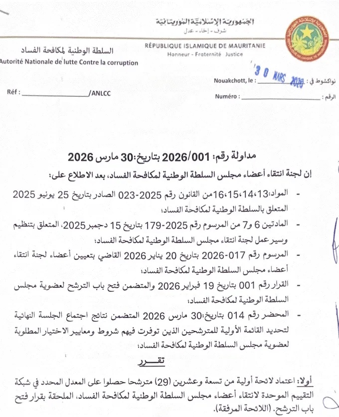 الراصد: أعلنت لجنة انتقاء أعضاء مجلس السلطة الوطنية لمكافحة الفساد في موريتانيا، عبر مداولة رسمية اعتماد اللائحة الأولية للمترشحين المقبولين لعضوية مجلس السلطة.