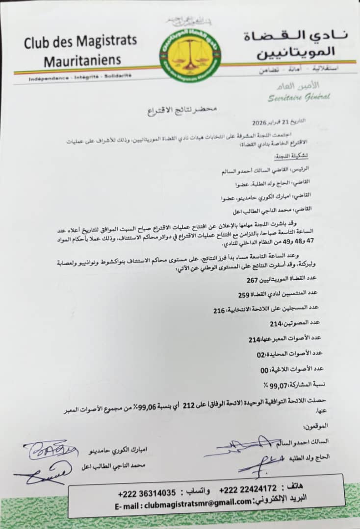 الراصد : أعلنت اللجنة المشرفة على انتخابات نادي القضاة الموريتانيين، اليوم السبت 21 فبراير 2026، النتائج الرسمية لاقتراع تجديد هيئات النادي، وذلك بعد يوم انتخابي شهد مشاركة واسعة من القضاة على عموم التراب الوطني.