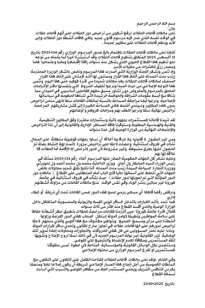وفي ختام بيانهن، أكدت مالكات القاعات استعدادهن للتعاون مع السلطات لإنجاح المسار الإصلاحي، شريطة أن يكون “عادلاً ومنصفًا ويحمي المستثمر الجاد من مظاهر الفساد والزبونية التي أفسدت القطاع لسنوات”.