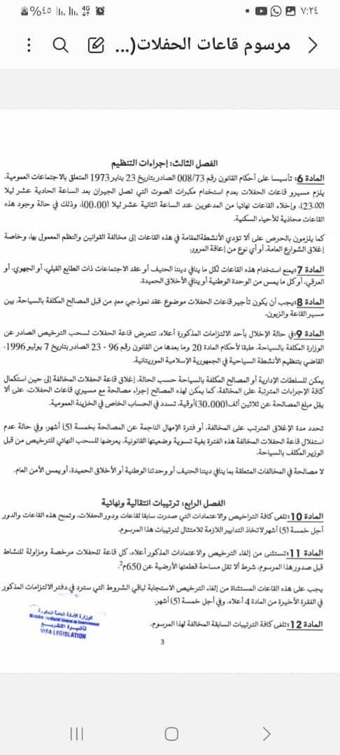 وأشادت المالكـات في بيان أصدرنه بـ"القرار الإصلاحي الشجاع" الذي اتخذته وزيرة التجارة والسياحة زينب منت أحمدناه، معتبرات أنه خطوة مهمة لتنظيم قطاع يشكل مصدر رزق لعشرات الأسر، لكنهن طالبن بمراجعة بعض الشروط الواردة في دفتر الالتزامات “الذي أُقرّ دون تشاور مع الفاعلين في الميدان”.