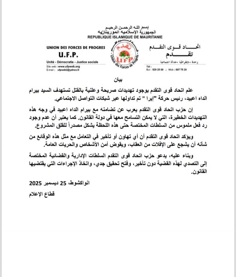 الراصد : أعلن حزب اتحاد قوى التقدم عن تضامنه مع النائب البرلماني ورئيس حركة إيرا بيرام الداه اعبيد في وجه "التهديدات الخطيرة التي تعرض لها".