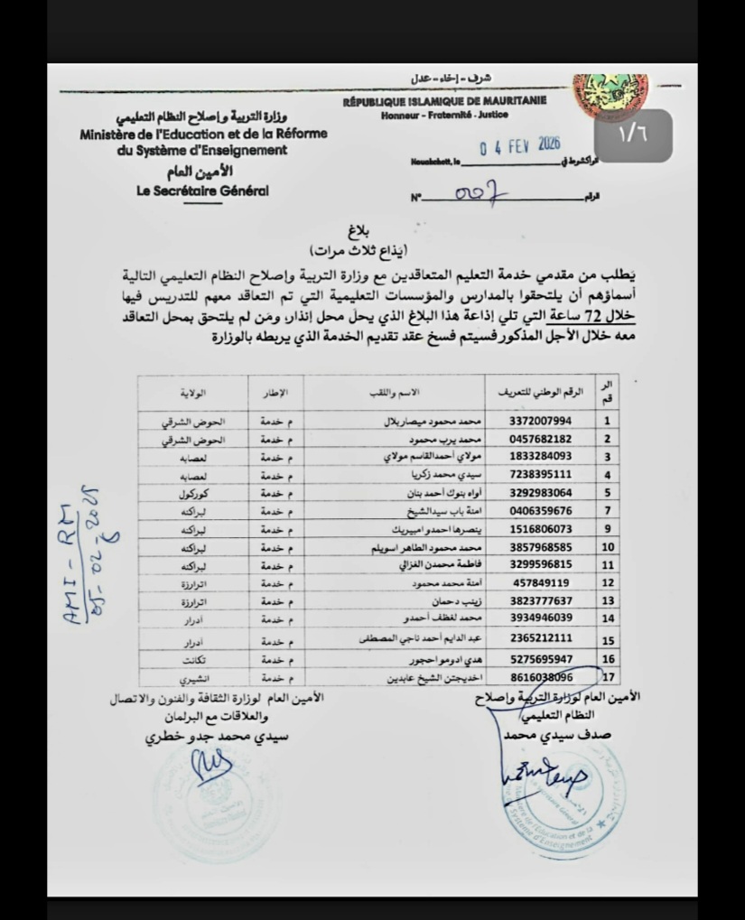 بنشاب : هددت وزارة التربية فى بلاغ رسمى نشرته، 17 مقدم خدمة تعليم بفسخ عقودهم في حالة لم يلتحقوا بمقار عملهم.