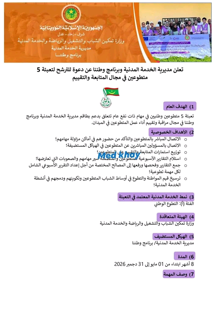 الراصد: تعلن مديرية الخدمة المدنية وبرنامج وطننا عن دعوة للترشح لتعبئة 5 متطوعين في مجال المتابعة والتقييم