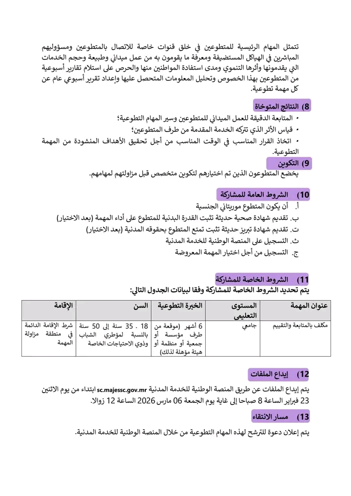 أ. أن يكون المتطوع موريتاني الجنسية ب. تقديم شهادة صحية حديثة تثبت القدرة البدنية للمتطوع على أداء المهمة ت. تقديم شهادة تبريز حديثة تثبت تمتع المتطوع بحقوقه المدنية ث. التسجيل على المنصة الوطنية للخدمة المدنية ج. التسجيل من أجل اختيار المهمة المعروضة