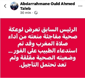 الراصد : اعلن محامي الرئيس السابق محمد ولد عبد العزيز ان موكله تعرض لوعكة صحية مفاجئة منعته من صلاة المغرب. واصاف المحامى عبد الرحمن ولد احمد طالب إن الرئيس السابق ولد عبد العزيز، تعرض لوعكة صحية مفاجئة، مساء امس الاثنين، منعته من أداء صلاة المغرب.